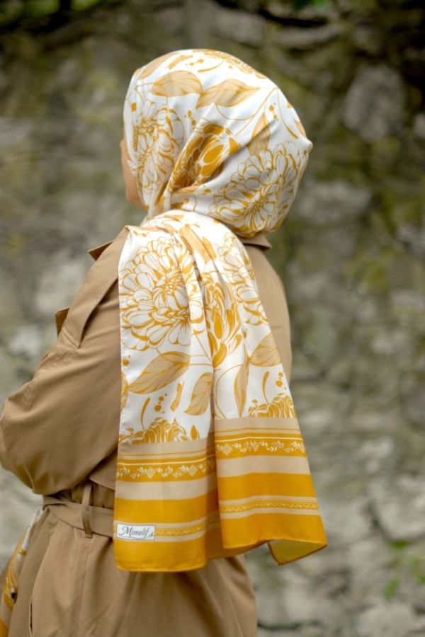 Mimelif Floral Pamuk Vual Desenli Şal Hardal