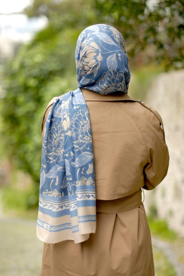 Mimelif Floral Pamuk Vual Desenli Şal Mavi