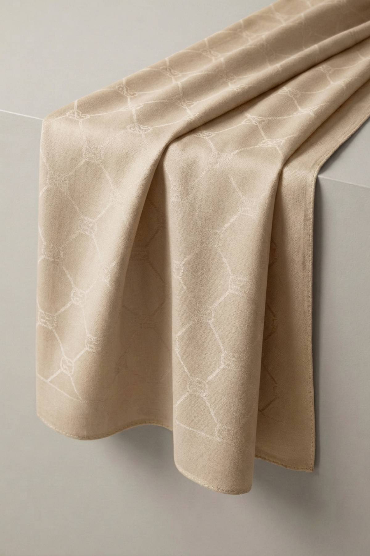 Zarif jakar dokuma tekniğiyle hazırlanan bu desenli şal, sade ve modern görünümüyle günlük kullanımdan klasik kombinlere kadar geniş bir stil alanına uyum sağlar. Kumaş yüzeyine dokuma tekniğiyle işlenen monogram desen, ürüne hem zarif bir doku hem de derinlik kazandırır.