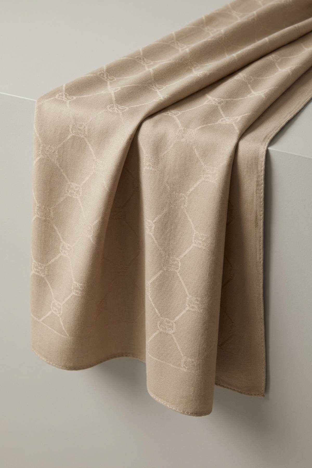 Zarif jakar dokuma tekniğiyle hazırlanan bu desenli şal, sade ve modern görünümüyle günlük kullanımdan klasik kombinlere kadar geniş bir stil alanına uyum sağlar. Kumaş yüzeyine dokuma tekniğiyle işlenen monogram desen, ürüne hem zarif bir doku hem de derinlik kazandırır.